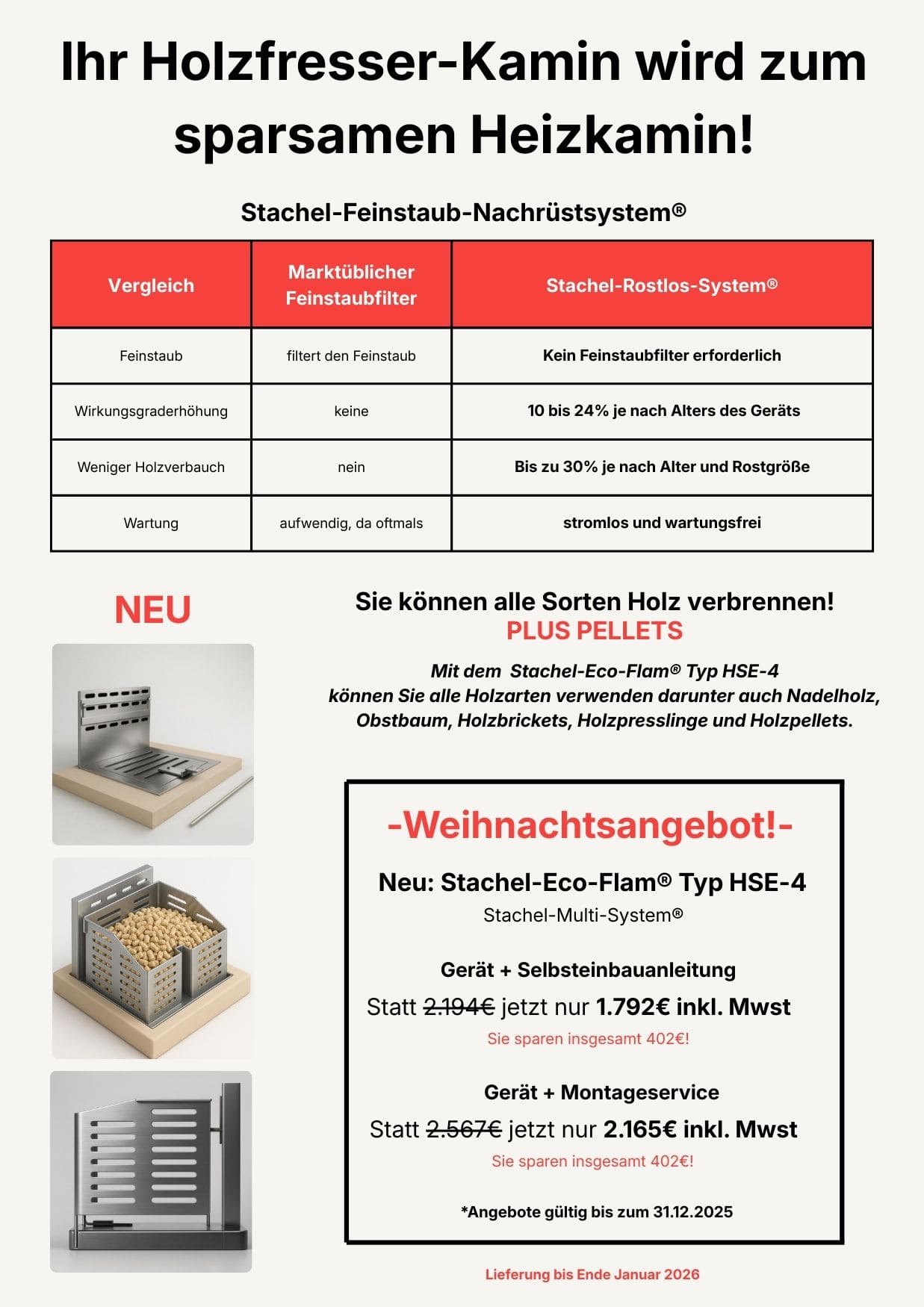 Führen Sie den Einbau selbst durch und erhalten Sie die Fachunternehmerbescheinigung für Ihren zuständigen Schornsteinfegermeister und Garantie durch Herrn Stachel, mit voller Wertigkeit wie beim professionellen Einbau.